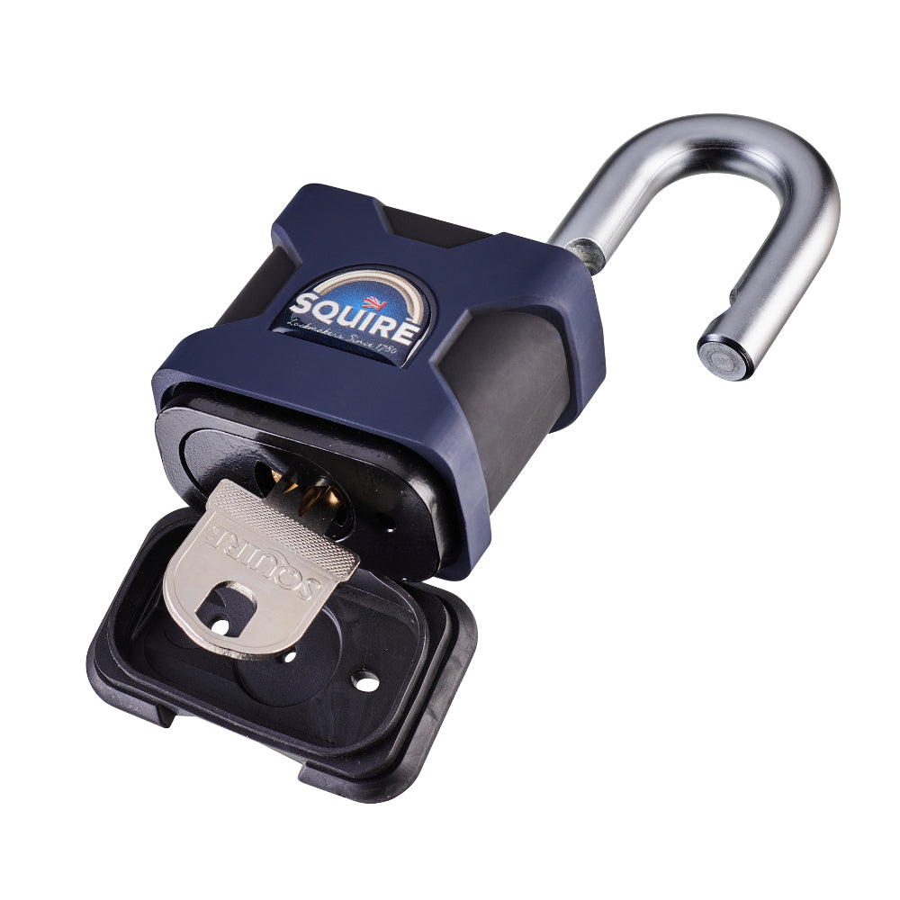 The Squire SS50S high security padlocks offers high security, quality and performance. The Squire SS50S high security padlock is a CEN 4 graded insurance padlock. The Squire SS50S padlock comes with a solid hardened steel lock body and offers high levels of corrosion resistance - the padlock has passed over 400 hours salt spray test. The high security padlock is suitable for harsh environments. The Squire SS50S padlock uses a 6 pin cylinder which offers over 250,000 key differs. This padlock comes with a restricted key profile - this means key blanks are restricted and are therefore very difficult to get keys cut. All Squire padlocks come with a 10 year guarantee.