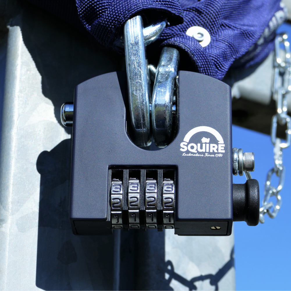 The Squire SHCB65 - 65mm slide bolt combination padlock offers quality and performance. This combi lock has a 4 wheel combination that can be changed at any time and has a straight shackle. This weatherproof coded padlock is suitable to be used outside and is an ideal padlock with code to be used with a security chain or on gates or workshop doors. All Squire number padlocks come with a 10 year guarantee.